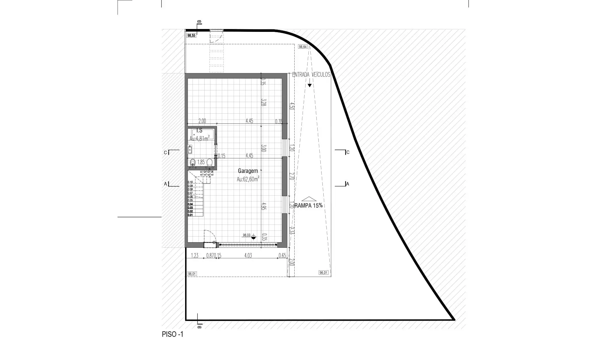 Piso -1: Garagem para 3 carros com portão automático, 1 WC completo, zona técnica e um amplo espaço